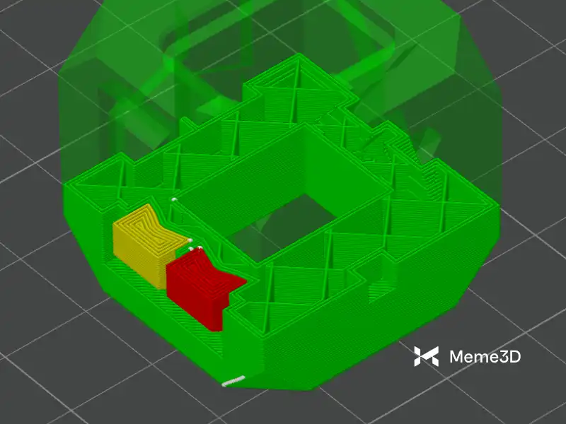 Hãy chú ý rằng lớp này bắt đầu bằng màu đỏ, thực hiện một lần thay đổi sợi nhựa (khi vòi phun biến mất trong giây lát) sang màu xanh lá cây, sau đó thực hiện lần thay đổi sợi nhựa thứ hai sang màu vàng. Sau đó, nó hoàn thành lớp này, chuyển lên lớp tiếp theo và tiếp tục in màu vàng cho lớp đó mà không cần thay đổi sợi nhựa nữa.