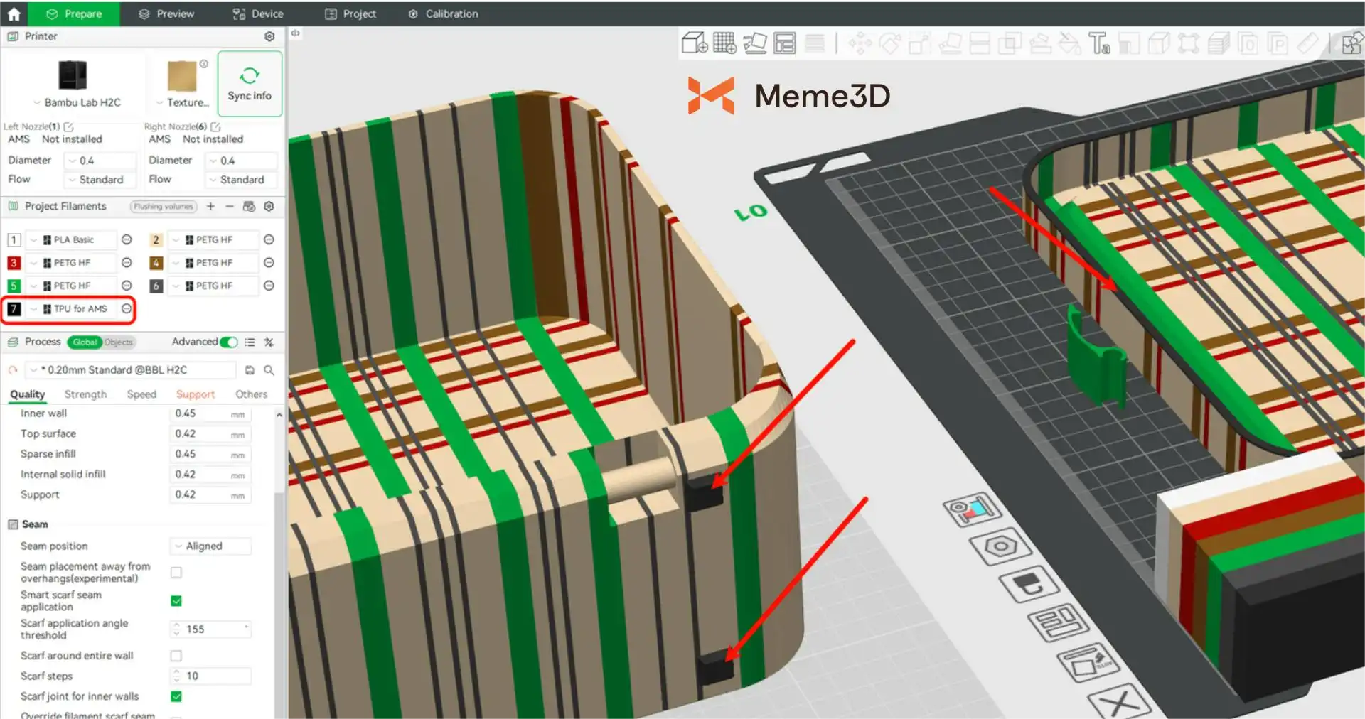 Vấn đề là gì? Một số vật liệu, chẳng hạn như TPU và PLA, ngay cả khi được in hoàn hảo, vẫn không bám dính tốt với nhau. Điều này có thể khiến bản in bị tách lớp tại các đường nối giữa các vật liệu chỉ với một lực tác động nhỏ.