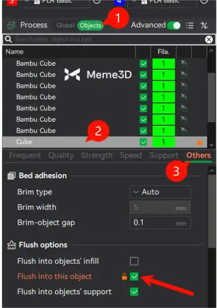 Tùy chọn “Xả vào đối tượng này” chỉ có thể truy cập được khi chọn ít nhất một đối tượng trong tab Quy trình > Đối tượng. Điều này là do tùy chọn này phải được áp dụng cho ít nhất một đối tượng khi có thêm một đối tượng đa vật liệu khác có sự thay đổi sợi in gây ra hiện tượng xả.