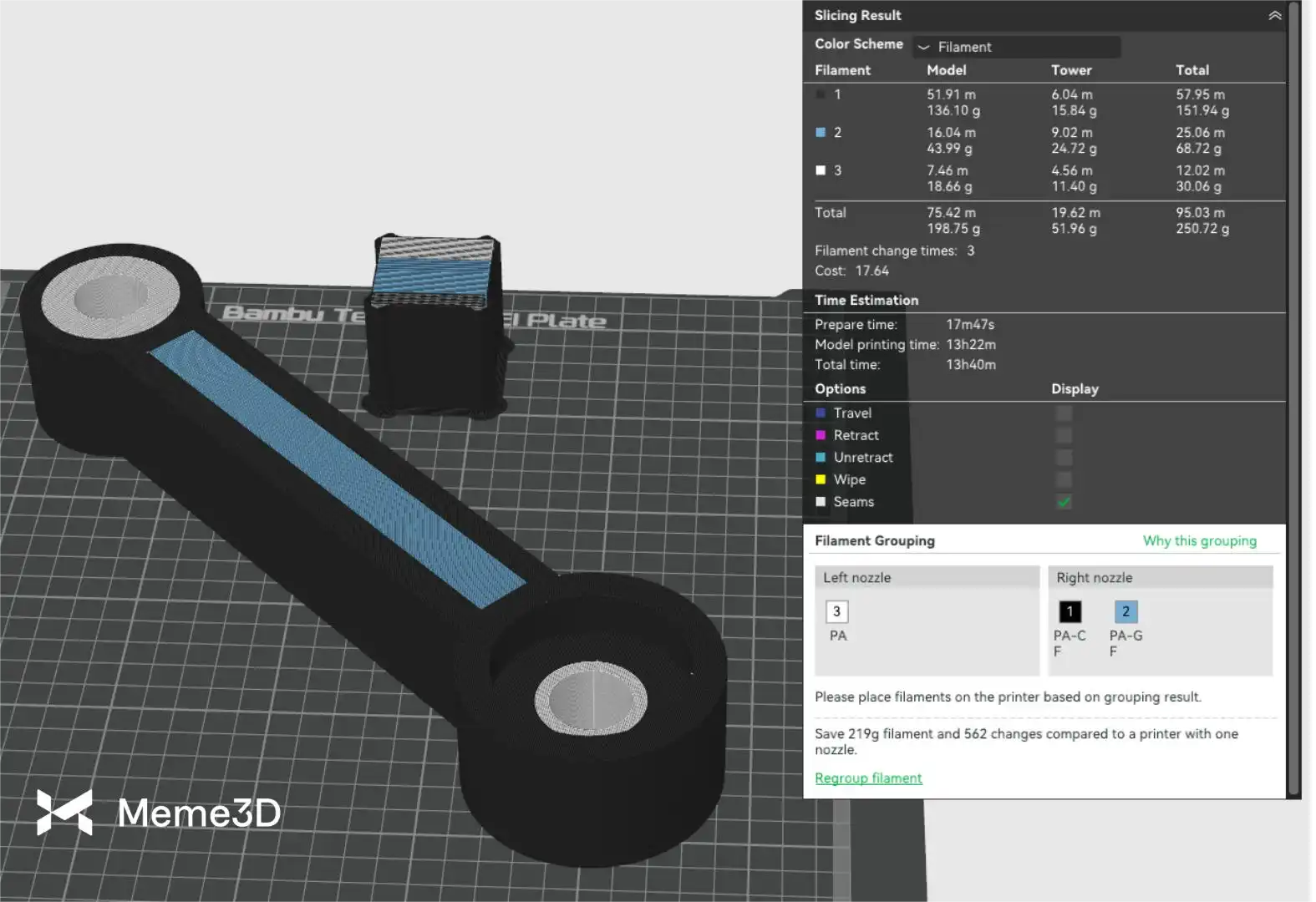 Trong ví dụ minh họa bên dưới, việc đặt chi tiết nằm phẳng sang một bên đã giúp giảm gần 80% số lần thay dây filament và lượng filament bị lãng phí, đồng thời tiết kiệm được 70% thời gian. Điều đó có nghĩa là tiết kiệm được 10 giờ và 200g filament cho một chi tiết nặng khoảng 35g!