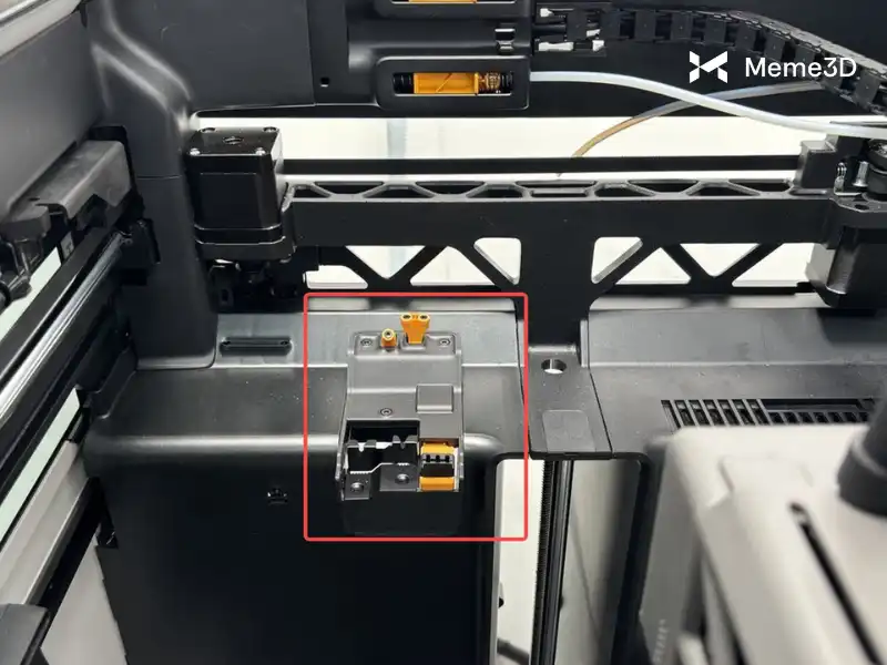 Ngay sau khi sợi nhựa được đẩy ra, đầu in sẽ kích hoạt cần gạt màu vàng để đảm bảo sợi nhựa đã được đẩy ra khỏi vòi phun. Sau đó, vòi phun được lau sạch trên miếng đệm silicon để loại bỏ bất kỳ mảnh vụn nào còn sót lại.