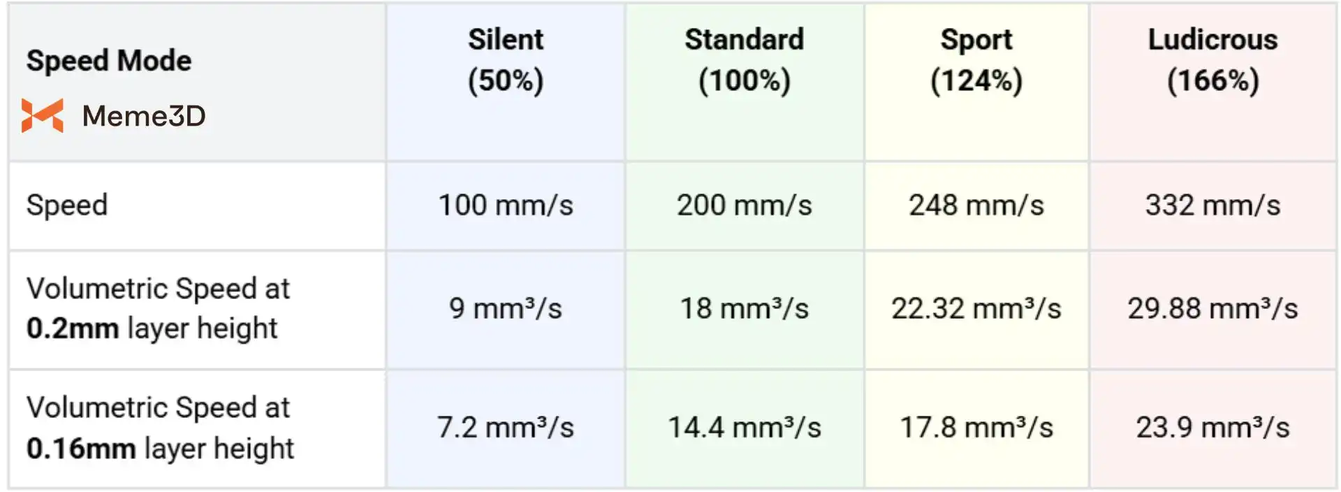 Nhìn chung, chiều cao lớp in thấp hơn sẽ làm giảm tốc độ thể tích. Sử dụng công thức trên, duy trì tốc độ 200 mm/s và chiều rộng lớp 0,45 mm , việc giảm chiều cao lớp từ 0,2 xuống 0,16 mm sẽ dẫn đến giảm tốc độ thể tích từ 18 mm³/s xuống 14,4 mm³/s. Sự giảm này tạo ra một khoảng dự phòng cho tốc độ thể tích trong trường hợp tốc độ in được tăng lên. Hãy lặp lại bảng trên và so sánh các giá trị ở chiều cao lớp 0,2 mm với chiều cao lớp 0,16 mm.
