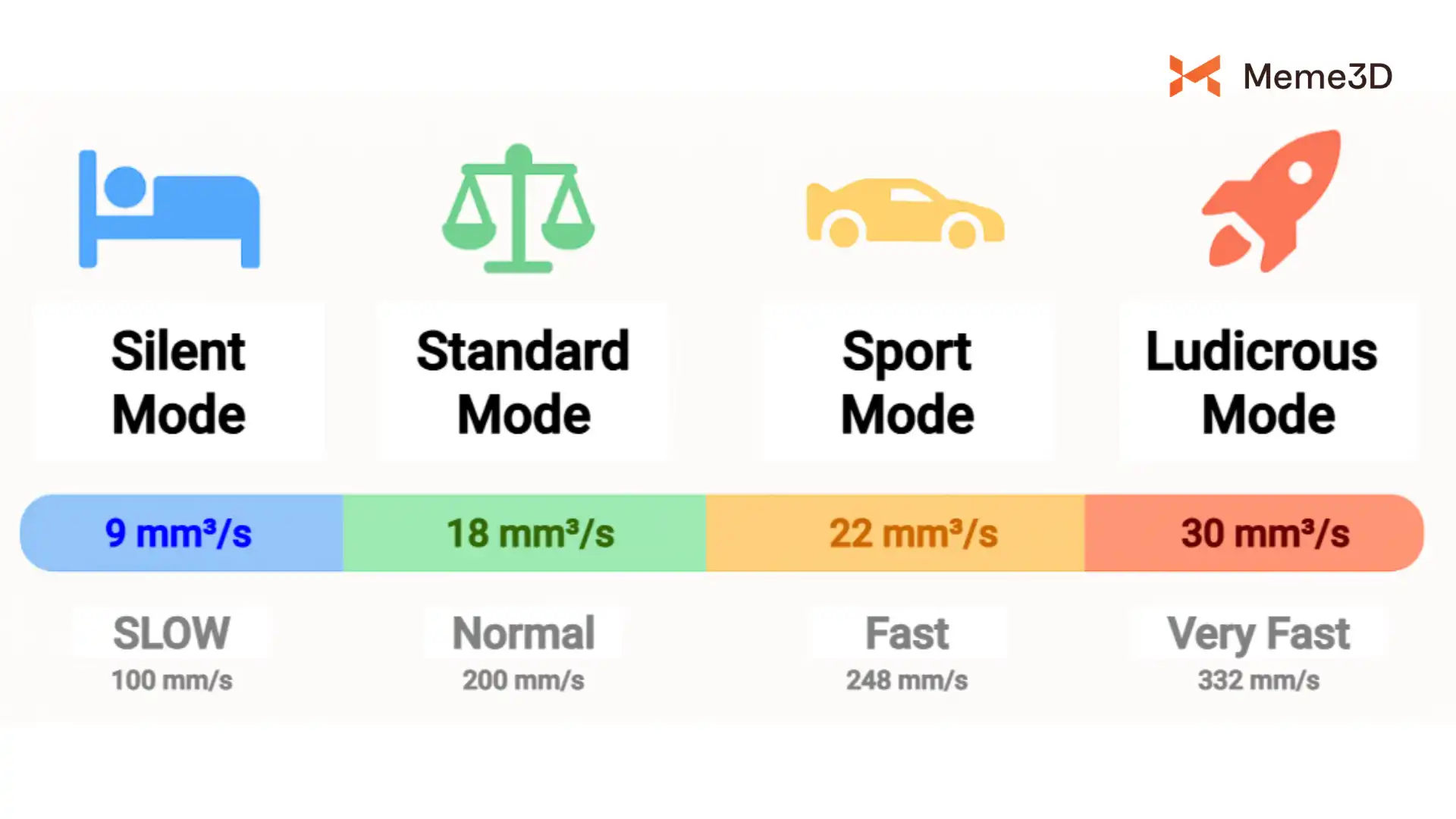 Tuy nhiên, cần lưu ý rằng Speed Modes chỉ điều chỉnh tốc độ chuyển động tổng thể của máy. Các tham số riêng của filament vẫn giữ nguyên. Vì vậy, việc thay đổi Quick Speed Mode trong khi đang in có thể gây ra sự không khớp giữa các tham số đã được cấu hình trước và tốc độ máy đã được điều chỉnh.