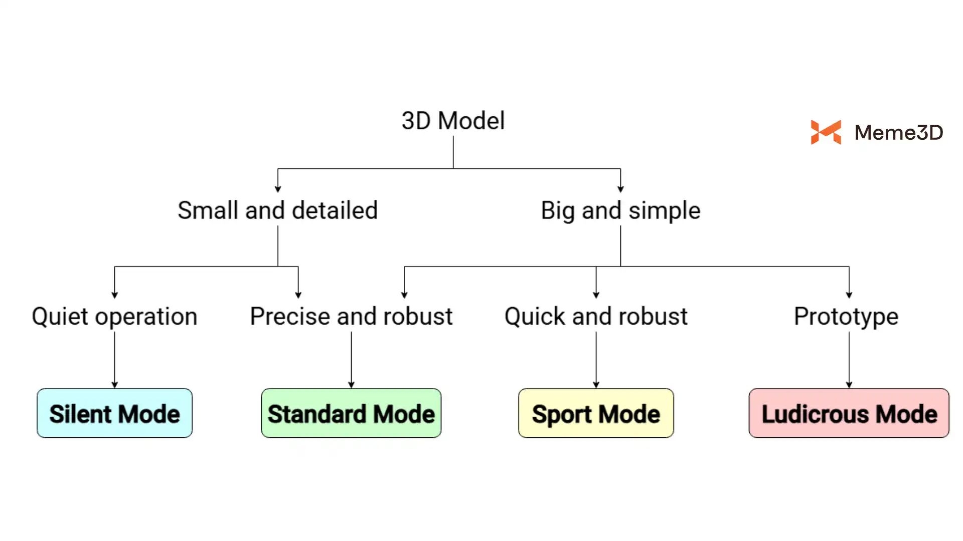 Ludicrous Mode ưu tiên tốc độ lên hàng đầu. Nó dành cho các model rất đơn giản hoặc nguyên mẫu khi mục tiêu chính là tạo ra chi tiết nhanh nhất có thể. Ở chế độ này, máy hoạt động ở tốc độ tối đa, có thể gây ra lỗi bề mặt, giảm độ chính xác chi tiết hoặc làm yếu liên kết giữa các lớp. Vì vậy, Ludicrous Mode chỉ nên dùng cho các chi tiết không yêu cầu về thẩm mỹ và độ bền, như bản in nháp hoặc mẫu thử nhanh.
