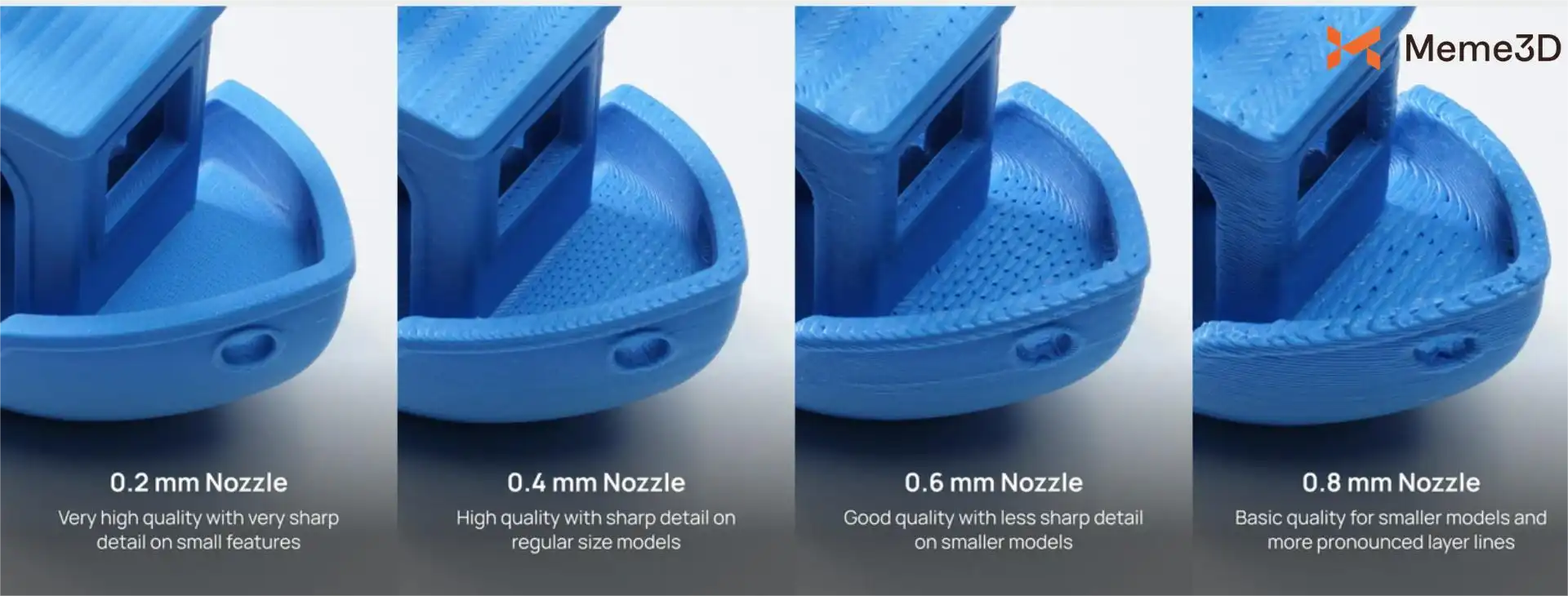 Với đường kính nozzle lớn hơn, mỗi đường filament sẽ có tiết diện lớn hơn. Điều này có nghĩa là extruder có thể đẩy nhiều nhựa hơn qua nozzle với cùng tốc độ di chuyển của đầu in (toolhead).
