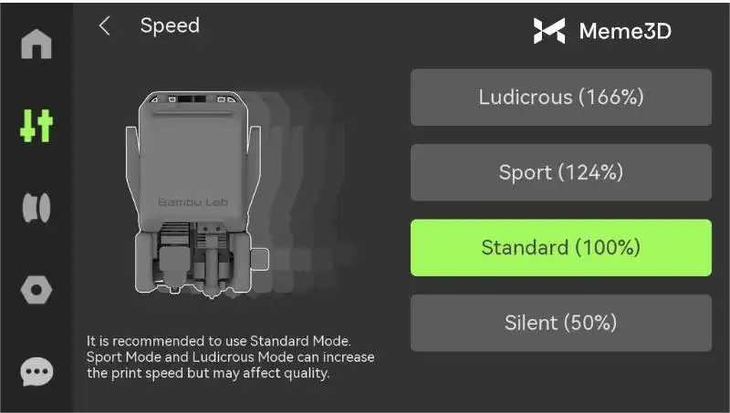 Speed Modes là các preset tốc độ đơn giản mà bạn có thể chọn, chẳng hạn như Silent Mode, Standard Mode, Sport Mode và Ludicrous Mode, như được hiển thị trong hình bên dưới. Chúng điều chỉnh (scale) toàn bộ tốc độ chuyển động trong quá trình in, mà không thay đổi các thiết lập chi tiết khác trong Bambu Studio.