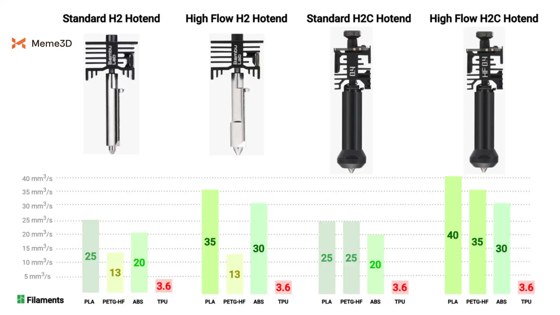Tốc độ thể tích tối đa trên H2C khác nhau giữa hotend bên trái và bên phải, vì hotend quyết định tốc độ filament có thể được làm nóng chảy, còn extruder kiểm soát độ ổn định khi đẩy filament. Hotend bên trái của H2C, cũng như trên các máy H2D và H2S, là giống nhau, chỉ có hotend bên phải là riêng của H2C. Tất cả những yếu tố này kết hợp lại tạo nên giới hạn vật lý về lượng vật liệu có thể được đùn ra mỗi giây.