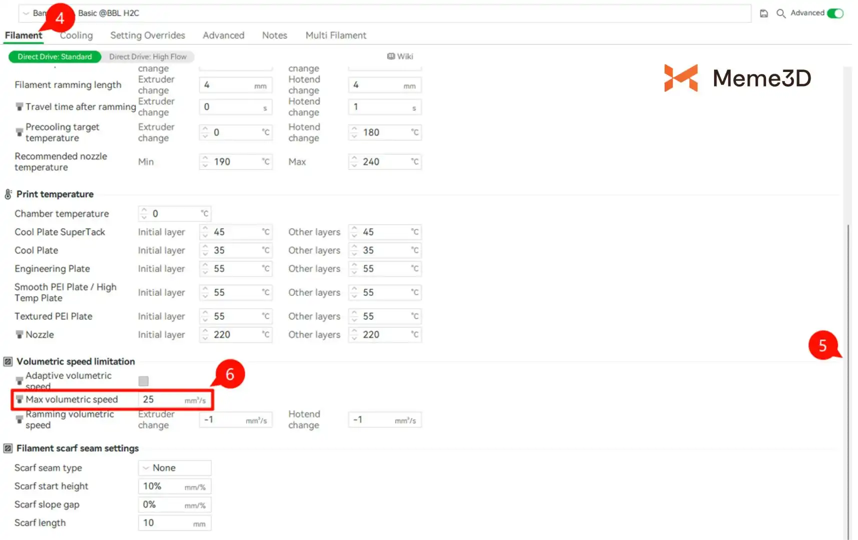 Trên Bambu Lab H2C được trang bị Bambu PLA Basic, tốc độ thể tích tối đa được đặt ở mức 25 mm³/s. Giá trị này đại diện cho giới hạn đùn tối đa mà hotend và filament có thể duy trì một cách ổn định.