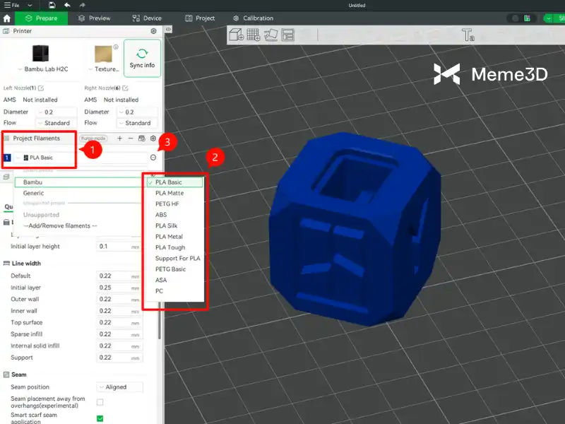 Không cần thực hiện các thử nghiệm phức tạp với các loại filament, nozzle hay nhiệt độ khác nhau, tất cả những gì bạn cần làm là truy cập vào mục filament trong Bambu Studio (1), sau đó chọn vật liệu mong muốn (2) và nhấn để chỉnh sửa preset (3).