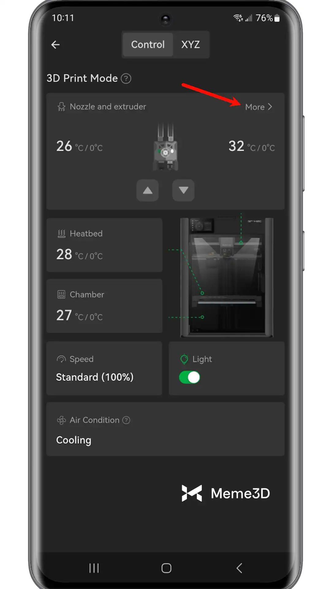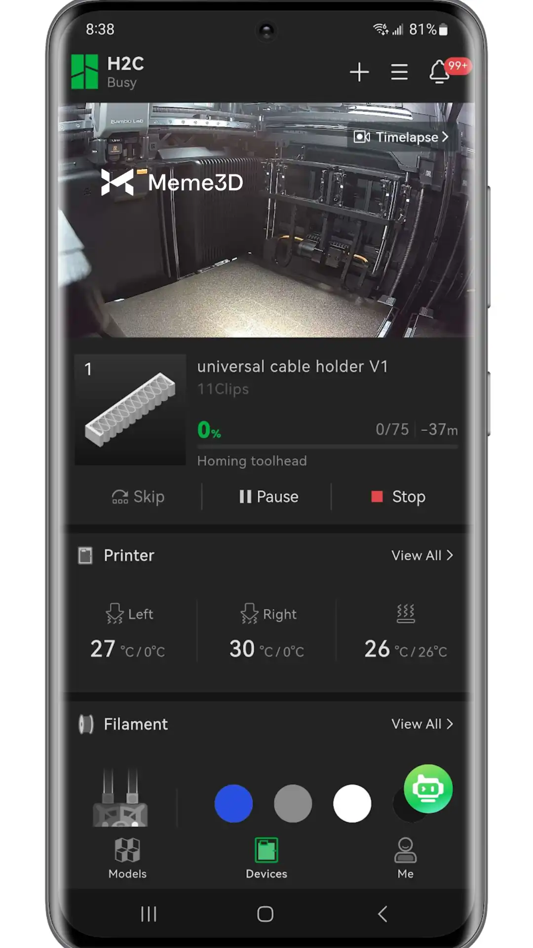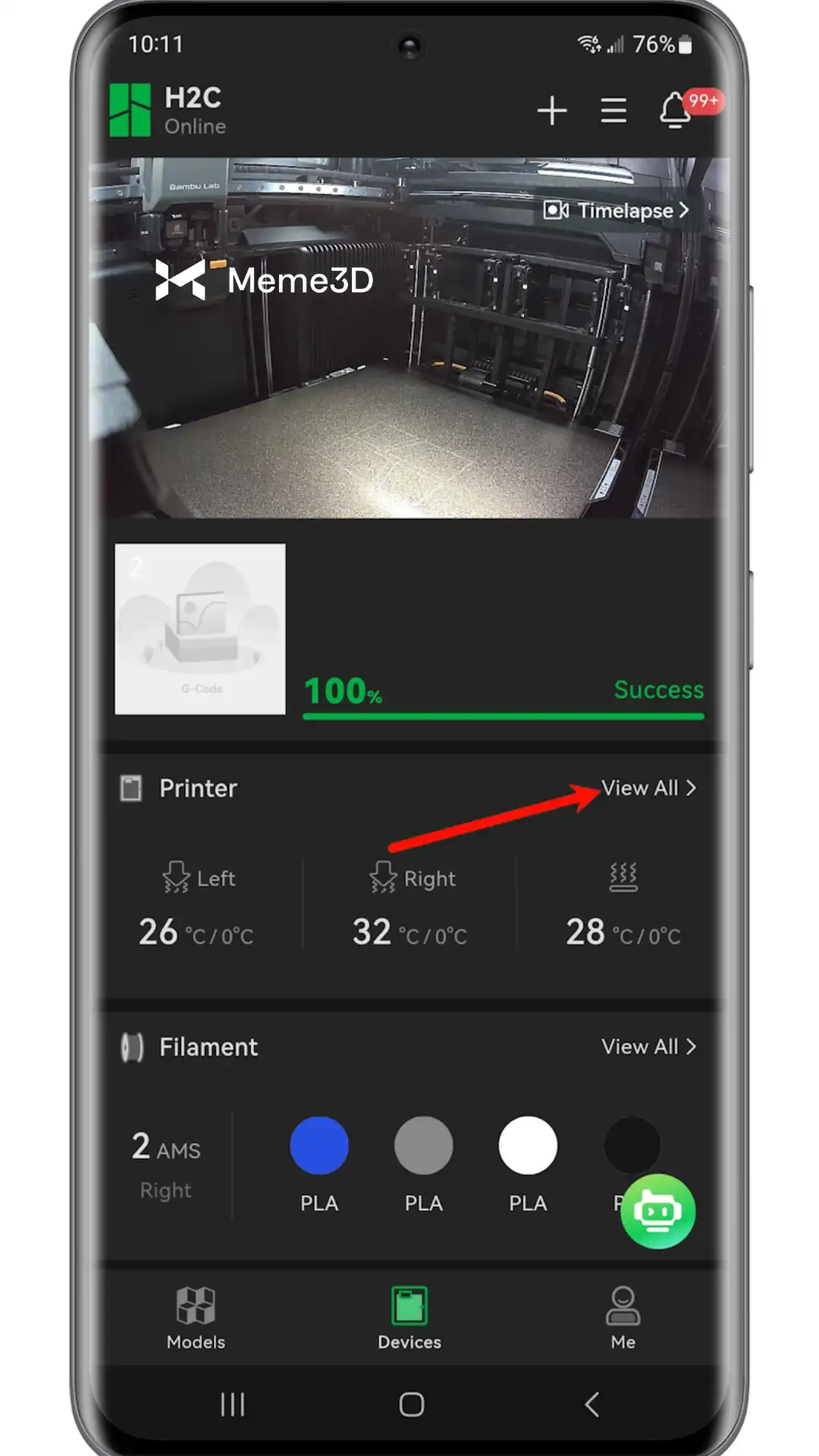 Bambu Handy cũng có các chức năng để quản lý hệ thống Vortek. Chức năng này có thể được tìm thấy bằng cách điều hướng đến mục Thiết bị, chọn máy in H2C, sau đó vào Máy in > Xem tất cả.