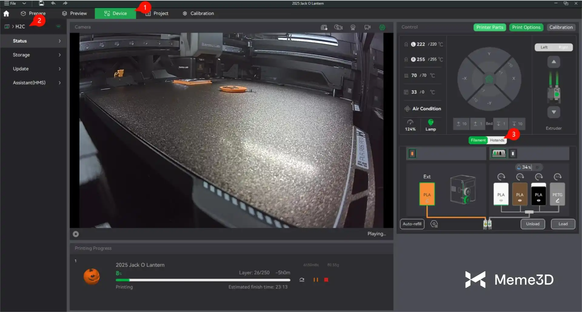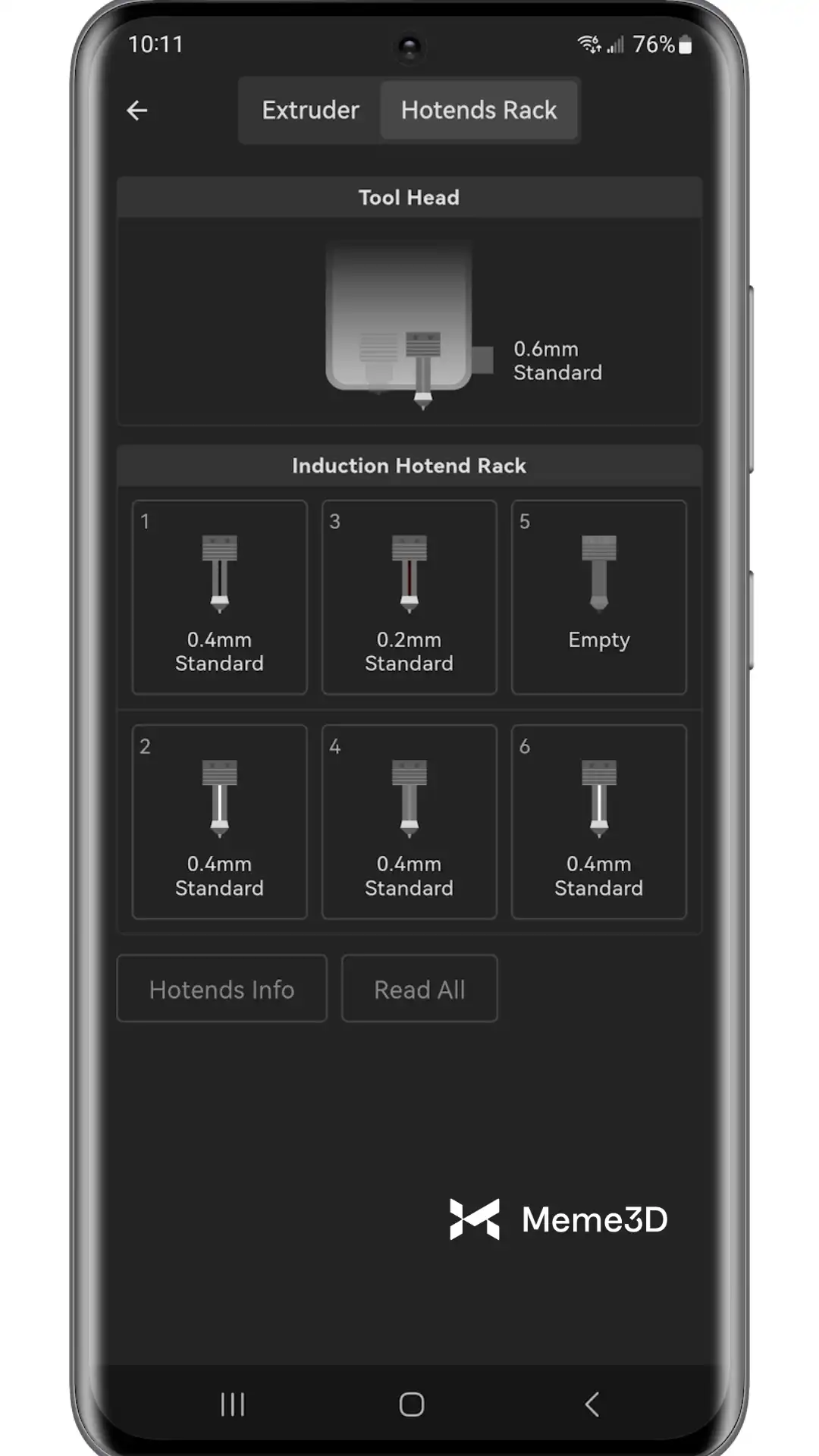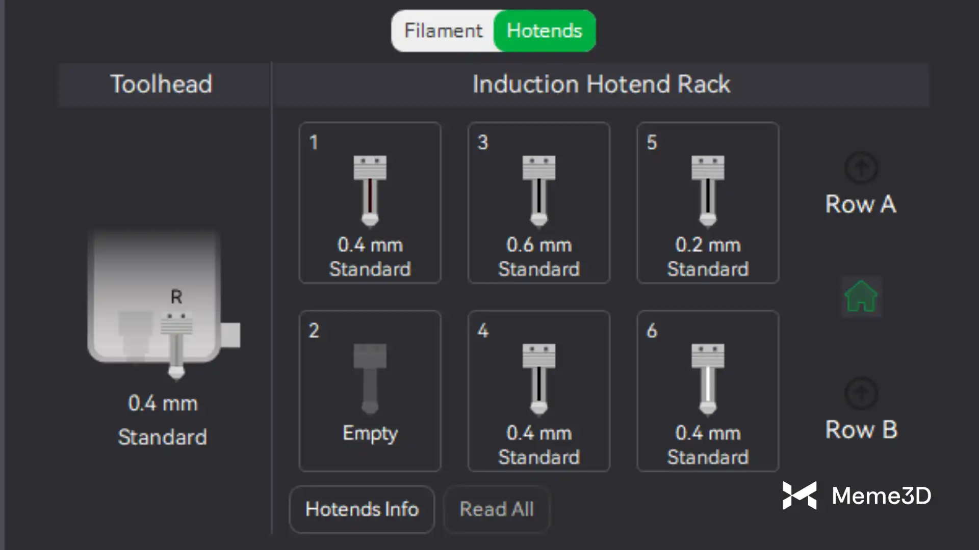Tab Hotends gần như giống hệt với tab Hotends & Rack trên màn hình cảm ứng của máy in. Từ màn hình này, người dùng có thể quản lý các đầu phun cảm ứng H2C Vortek và giá đỡ đầu phun theo cách tương tự như trên màn hình máy in, với bố cục giống hệt nhau.