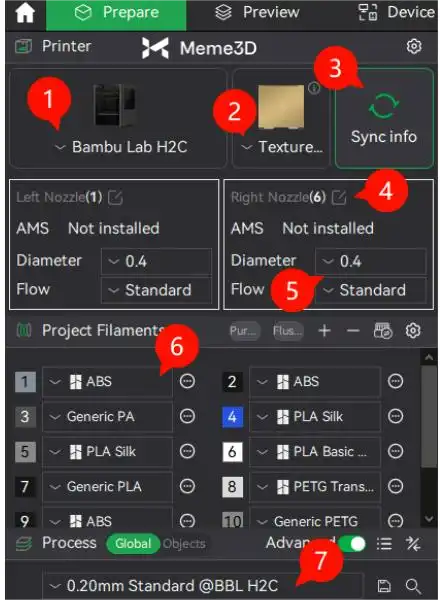 Từ trong Bambu Studio, điều hướng đến tab Thiết bị và đảm bảo máy in H2C đã được chọn. Ở phía bên phải của trang Thiết bị, chọn tab Đầu phun.