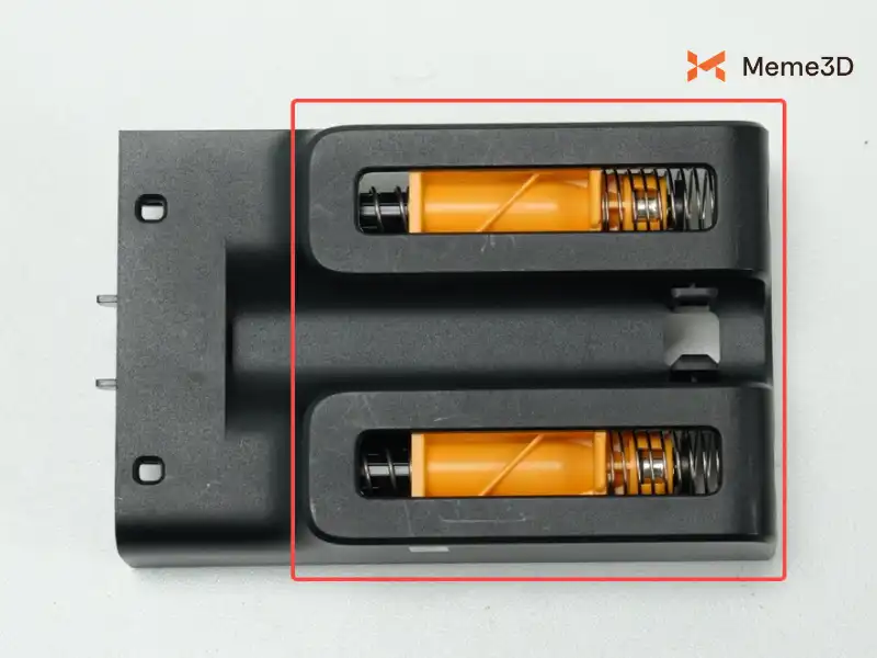 Ngoài ra, khi in với cuộn dây ngoài, bộ phận đệm cũng có chức năng phát hiện rối dây, có thể phát hiện xem cuộn dây ngoài có bị rối hay không. Khi cuộn dây bị rối, lực căng của đầu đùn kéo sợi nhựa sẽ nén một lò xo trong bộ phận đệm sợi nhựa. Cảm biến được kết nối sẽ truyền thông tin này đến Hệ thống Giám sát Sức khỏe của H2C, hệ thống này sẽ tạm dừng quá trình in và hiển thị thông báo để thông báo cho người dùng.
