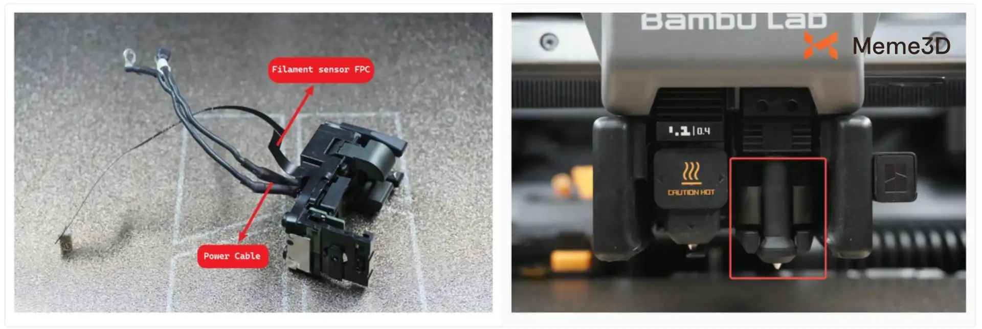 Cụm đầu phun bên phải cũng bao gồm một cảm biến dòng xoáy bên phải hỗ trợ các chức năng thiết yếu như định vị trục Z, cân bằng bàn in và hiệu chỉnh dòng chảy động.