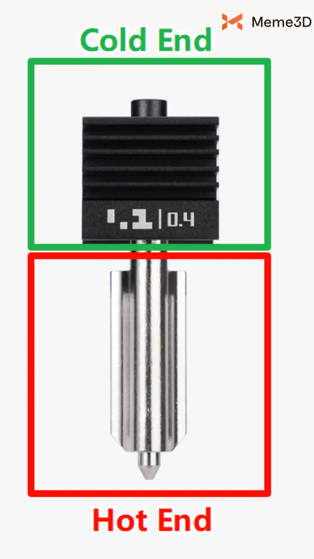 Theo truyền thống, trong in 3D, phần dưới của đầu gia nhiệt nơi đặt vòi phun được gọi là “Đầu gia nhiệt” (Hot End) và phần trên với bộ tản nhiệt được gọi là “Đầu lạnh” (Cold End). Ngày nay, thuật ngữ “đầu gia nhiệt” thường dùng để chỉ toàn bộ cụm chi tiết. Trong hình bên dưới, chúng ta có thể thấy các phần này trên một đầu gia nhiệt thay nhanh H2 nguyên bản, nằm ở khe bên trái của đầu công cụ H2C.