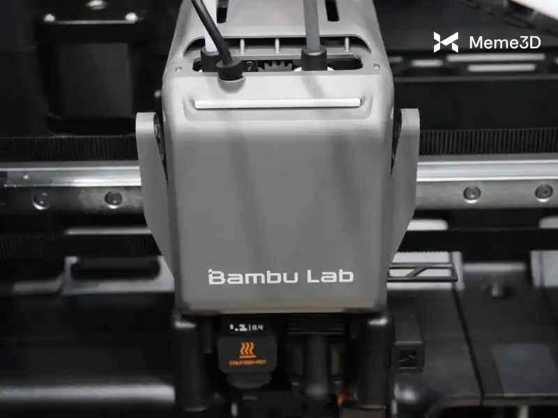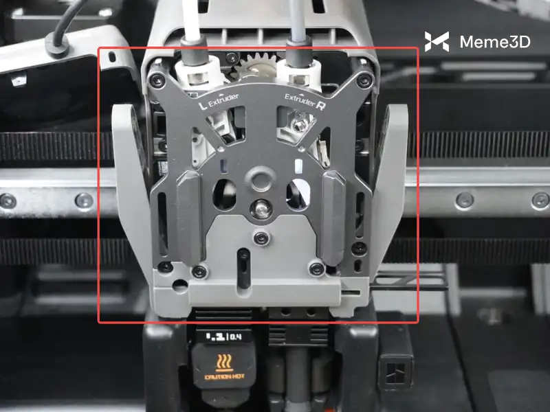 Máy in 3D H2C được trang bị hai cụm đầu phun riêng biệt, có thể nhìn thấy ở phía dưới đầu in. Mỗi đầu phun chịu trách nhiệm tiếp nhận, làm nóng chảy và phun sợi nhựa được cấp bởi bộ đùn từ bộ đệm sợi nhựa tương ứng.