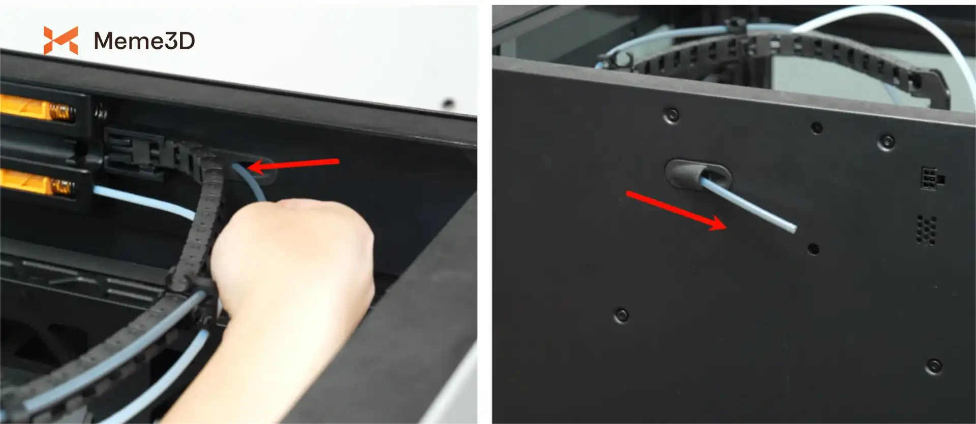 Vì các sợi TPU tiêu chuẩn không được thiết kế để chạy qua bộ đệm sợi, nên một đầu vào TPU riêng biệt được đặt cạnh bộ đệm sợi. Ống PTFE nối với bộ đệm sợi cho vòi phun bên phải của máy đùn có thể được tháo rời khỏi bộ đệm sợi để sử dụng cho mục đích này. Luôn luôn sử dụng vòi phun bên phải khi in các sợi TPU 85A và 90A. Sợi TPU dùng cho AMS có thể được in giống như bất kỳ sợi nào khác không phải TPU.