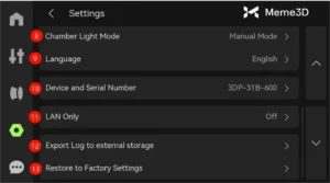 - Tùy chọn in – Có thể điều khiển nhiều tính năng khác nhau của máy in, bao gồm Giám sát in bằng AI, Phát hiện bàn in, Tự động phục hồi khi mất bước, Phát hiện cửa mở, Lưu trữ tệp đã gửi trên bộ nhớ ngoài, cảm biến chuyển động, Nâng cao độ chính xác chuyển động và Chụp ảnh kết quả in.