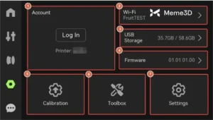 - Cài đặt – Hiển thị danh sách các mục menu phụ có thể điều chỉnh để kiểm soát các cài đặt khác nhau của máy in, chẳng hạn như Tài khoản, Hiệu chuẩn, Hộp công cụ, Wi-Fi, Phần mềm và Bộ nhớ USB.