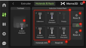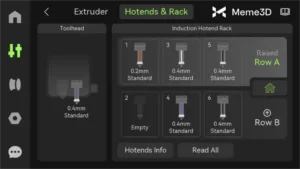 - Đầu công cụ – Mở tùy chọn Nest, cho phép lưu trữ đầu gia nhiệt hiện tại ở vị trí giá đỡ trống.