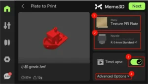 - Tùy chọn nâng cao – Cung cấp quyền truy cập vào các cài đặt nâng cao như Tự động cân bằng bàn in, Hiệu chuẩn động lực dòng chảy và Hiệu chuẩn độ lệch vòi phun.