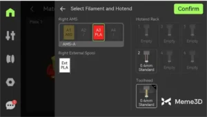 - Cài đặt sợi in – Truy cập menu cấu hình sợi in và AMS, nơi có thể điều chỉnh sợi in.
