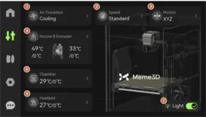 - Hệ thống điều hòa không khí – Được chia thành Chế độ làm mát và Chế độ sưởi ấm để giúp kiểm soát môi trường bên trong máy in. Bạn có thể điều chỉnh tốc độ của Quạt làm mát chi tiết, Quạt làm mát chi tiết phụ trợ, Quạt hút khí buồng in và Quạt tuần hoàn nhiệt buồng in. Ngoài ra còn có tùy chọn cài đặt nhiệt độ buồng in phù hợp.