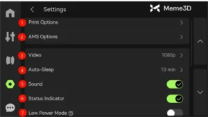 - Tùy chọn AMS – Có thể điều khiển các tính năng khác nhau của AMS, chẳng hạn như đọc sợi filament khi lắp vào, đọc sợi filament khi khởi động và tùy chọn sắp xếp thứ tự AMS.