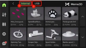 - Tệp in – Mở danh sách các mô hình 3D đã được tải sẵn có thể in, đồng thời hiển thị các tệp có sẵn trên ổ USB, sẵn sàng để in.