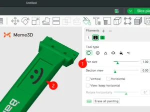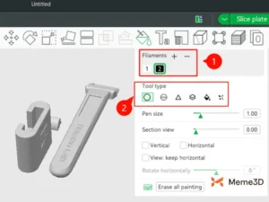 Trong tab Sợi, bạn có thể xem các màu sợi có sẵn cho AMS 2 PRO (1). Sau đó, chọn một công cụ tô màu (2) để bắt đầu tô màu cho các phần khác nhau của mô hình.