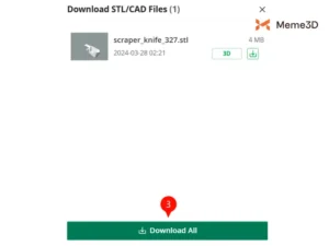 Một cửa sổ bật lên sẽ xuất hiện, hãy nhấp vào “Tải xuống tệp STL/CAD” (2).