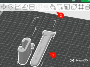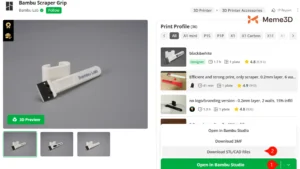 Mở mô hình dụng cụ cạo trong Bambu Studio bằng cách điều hướng đến mô hình tay cầm dụng cụ cạo Bambu trong Markerworld , sau đó cuộn xuống nút màu xanh lá cây “Mở trong Bambu Studio” và nhấp vào mũi tên nhỏ bên phải (1).