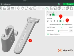 Các công cụ vẽ bạn sử dụng sẽ phụ thuộc vào hình dạng và chi tiết của mô hình. Để tô màu nhanh và chính xác, công cụ Tô màu (1) là một lựa chọn tuyệt vời. Chỉ với một cú nhấp chuột, công cụ Tô màu cho phép bạn tô màu toàn bộ các phần của mô hình. Chọn “Phát hiện cạnh” (2) để tô màu một khu vực chính xác (3).