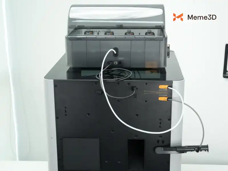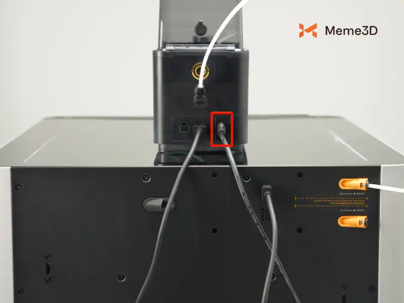 Tiếp theo, kết nối một đầu của cáp Bambu Bus 6 chân vào một trong hai cổng 6 chân trên AMS 2 Pro hoặc AMS HT, và đầu còn lại vào cổng tương ứng ở mặt sau của máy in.
