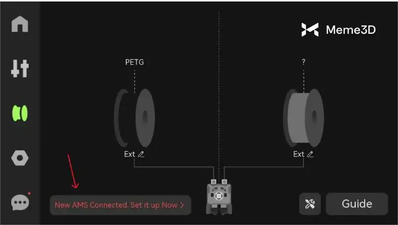 Máy in sẽ tự động phát hiện xem có thiết bị AMS nào được kết nối mới hay không. Hãy làm theo các bước hướng dẫn để khởi tạo thiết bị AMS nhằm kích hoạt cả chức năng đổi màu và sấy khô.