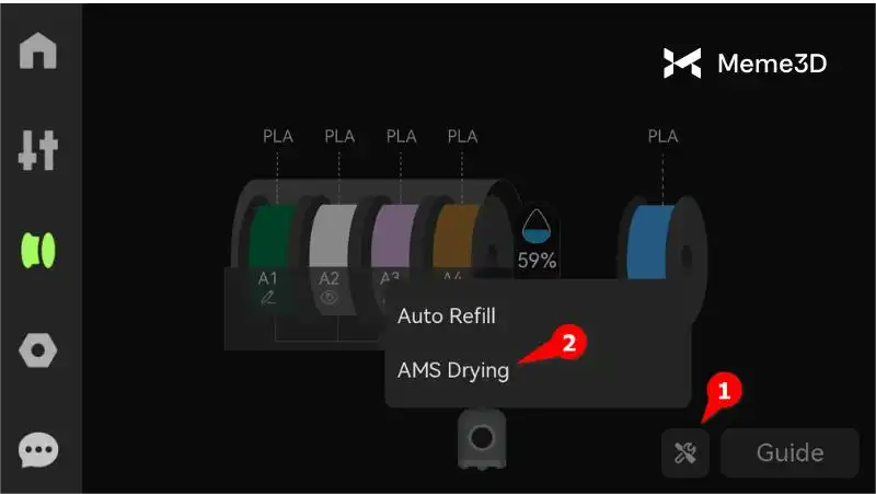 Chọn khe cắm sợi in để sấy. Đối với sợi in Bambu, RFID sẽ tự động cấu hình các cài đặt sấy (nhiệt độ, thời gian). Bạn cũng có thể tự cài đặt nhiệt độ (tối đa 65°C) và thời gian dựa trên loại sợi in (ví dụ: PLA: 45–55°C, 6-8 giờ).