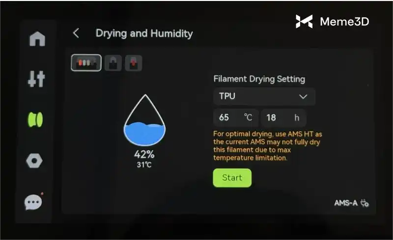Máy sấy AMS 2 Pro có khả năng đạt nhiệt độ sấy tối đa 65 °C, đủ để sấy khô hiệu quả hầu hết các loại sợi in 3D. Tuy nhiên, một số loại sợi có thể cần nhiệt độ cao hơn 65 °C. Trong trường hợp này, bạn sẽ thấy thông báo đề nghị sử dụng máy sấy AMS HT (có thể đạt đến 85 °C).