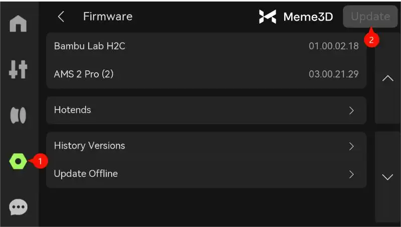 Để đạt hiệu suất tốt nhất, hãy đảm bảo rằng phần mềm H2C đã được cập nhật đầy đủ trước khi kết nối AMS 2 Pro hoặc AMS HT. Bạn có thể xem và cập nhật phiên bản phần mềm trong tab Cài đặt. Nếu có bản cập nhật, nút Cập nhật sẽ hoạt động ở góc trên bên phải. Điều này sẽ đảm bảo bạn được hưởng lợi từ bất kỳ tính năng bổ sung nào mà chúng tôi sẽ thêm vào theo thời gian.