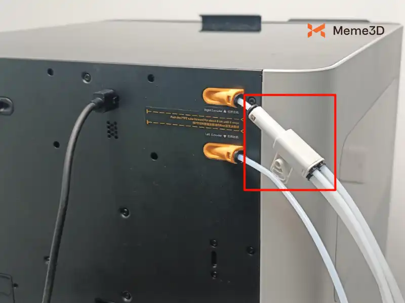Nối một đầu của ống PTFE 550 mm vào đầu ra sợi của AMS 2 Pro, và đầu kia vào đầu vào máy đùn mong muốn ở phía sau H2D. Nếu chỉ kết nối một AMS 2 Pro, chúng tôi khuyên bạn nên kết nối với đầu vào máy đùn bên phải, và sử dụng đầu vào máy đùn bên trái cho giá đỡ cuộn dây ngoài hoặc bộ phận AMS HT.