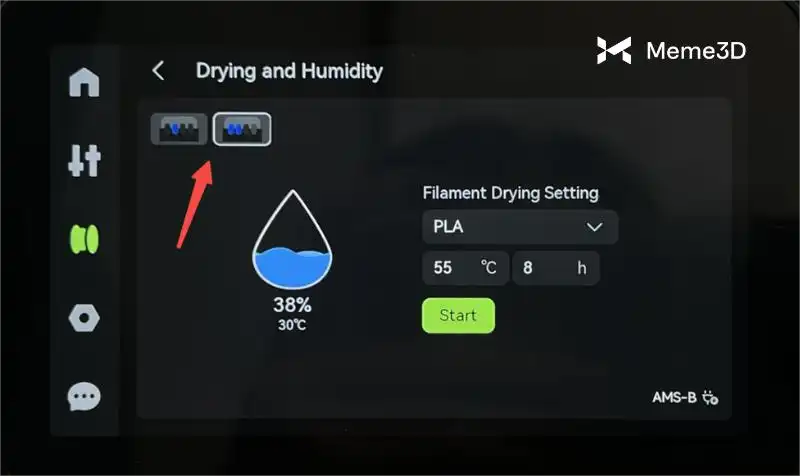 Ở phía trên bên trái, bạn có thể chọn (hoặc thay đổi lựa chọn) thiết bị AMS mà bạn muốn bắt đầu sấy.