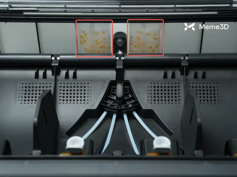 Lấy túi hạt màu trắng đục ra khỏi bao bì nhựa trong suốt và đặt các túi vào phần giữa phía sau của AMS 2 Pro, như hình minh họa bên dưới.