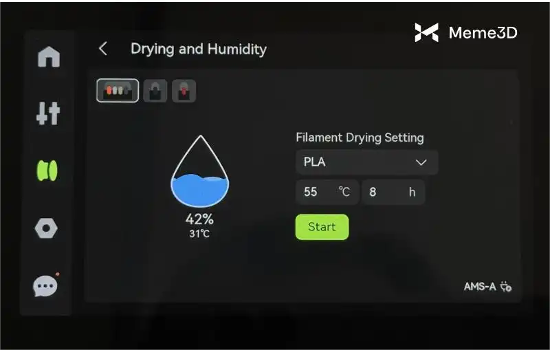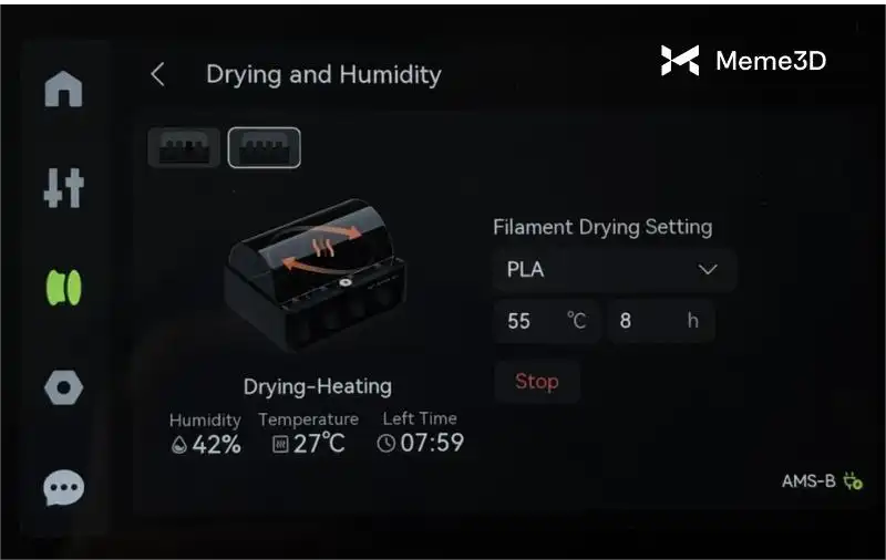 Một trong những nguyên nhân phổ biến nhất gây ra các vấn đề về chất lượng in là do sợi in hấp thụ hơi ẩm từ không khí. Vì chúng ta có thể khắc phục hiện tượng hấp thụ này bằng cách làm nóng và sấy khô cuộn sợi in, nên AMS 2 Pro và AMS HT được bán theo gói kết hợp H2C hoặc riêng lẻ, và có khả năng sấy khô sợi in cũng như thay đổi vật liệu.