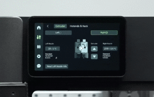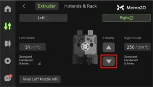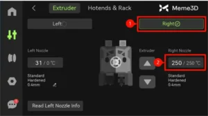 Trên màn hình, chọn Control → Nozzle & Extruder. Chọn Right Side (vòi bên phải), đặt nhiệt độ cao hơn mức in bình thường (ví dụ 250°C cho PLA).
