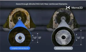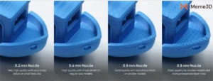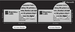 Ngoài ra, lỗ nhỏ hơn khiến nó dễ bị tắc nghẽn hơn, đặc biệt là với các tạp chất hoặc đường kính sợi không đồng nhất. Cuối cùng, các loại sợi được gia cường bằng sợi, chẳng hạn như sợi carbon hoặc sợi thủy tinh, không tương thích với vòi phun 0,2 mm vì các sợi này có thể dễ dàng làm tắc nghẽn lỗ nhỏ.