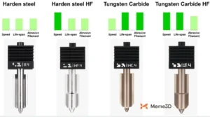 Đầu phun bằng vonfram cacbua được giới thiệu ngay trước khi H2C ra mắt. Đầu phun này có độ bền cao và duy trì hình dạng tròn và chính xác ngay cả sau thời gian sử dụng dài. So với thép tôi cứng, nó cho thấy độ mài mòn ít hơn đáng kể, ngay cả sau khi sử dụng nhiều kilogram sợi in.