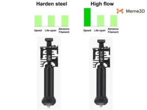 Chế độ High Flow (như tên gọi cho thấy) có lưu lượng sợi nhựa cao hơn trong quá trình in, vì cấu trúc vòi phun khác biệt làm tăng diện tích tiếp xúc giữa sợi nhựa và đầu in. Thiết kế này giúp tăng tốc độ in, từ đó có thể giảm thời gian in tổng thể.