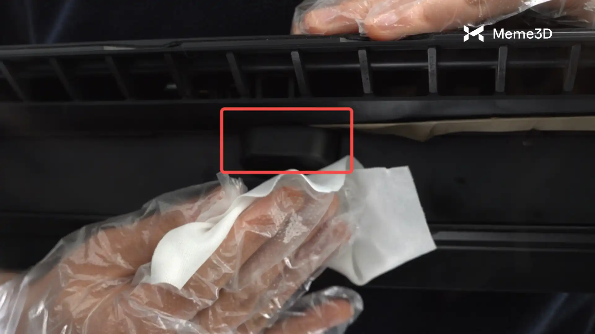 Lau sạch thanh dẫn hướng tuyến tính trục Y bằng vải không dệt đã được xịt cồn, sau đó di chuyển đầu dụng cụ để làm sạch các phần bị che khuất của thanh dẫn hướng.