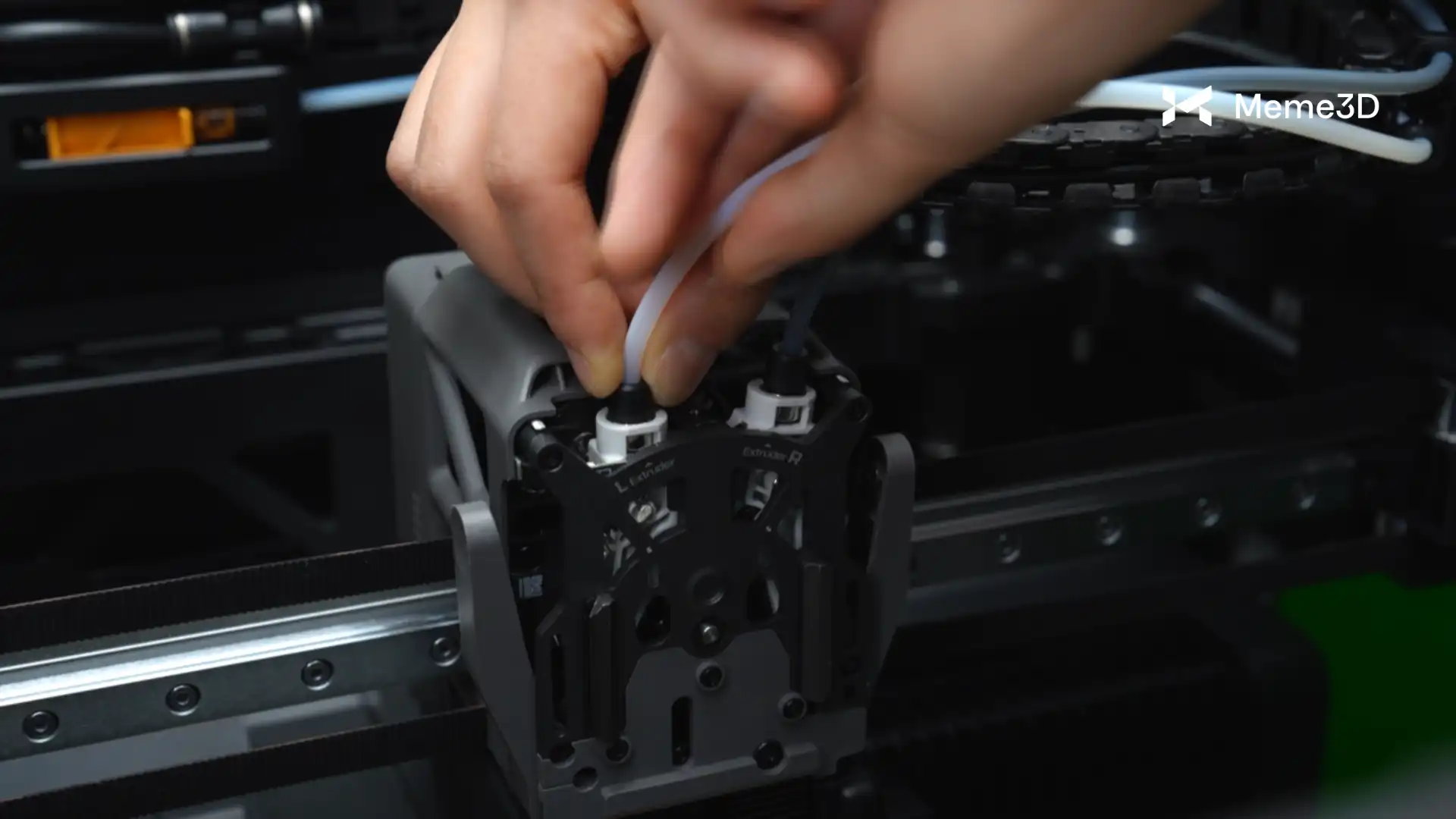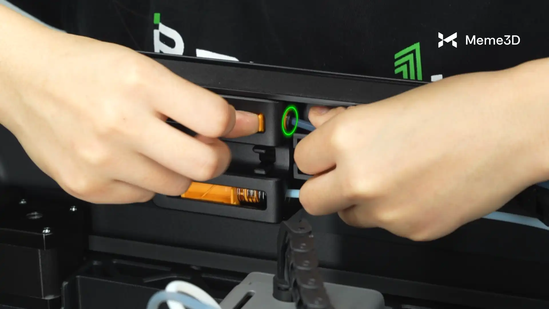 Để tháo ống PTFE, chỉ cần nhấn vào vòng ngoài màu đen để mở khóa hai đầu nối phía trên bộ đùn.