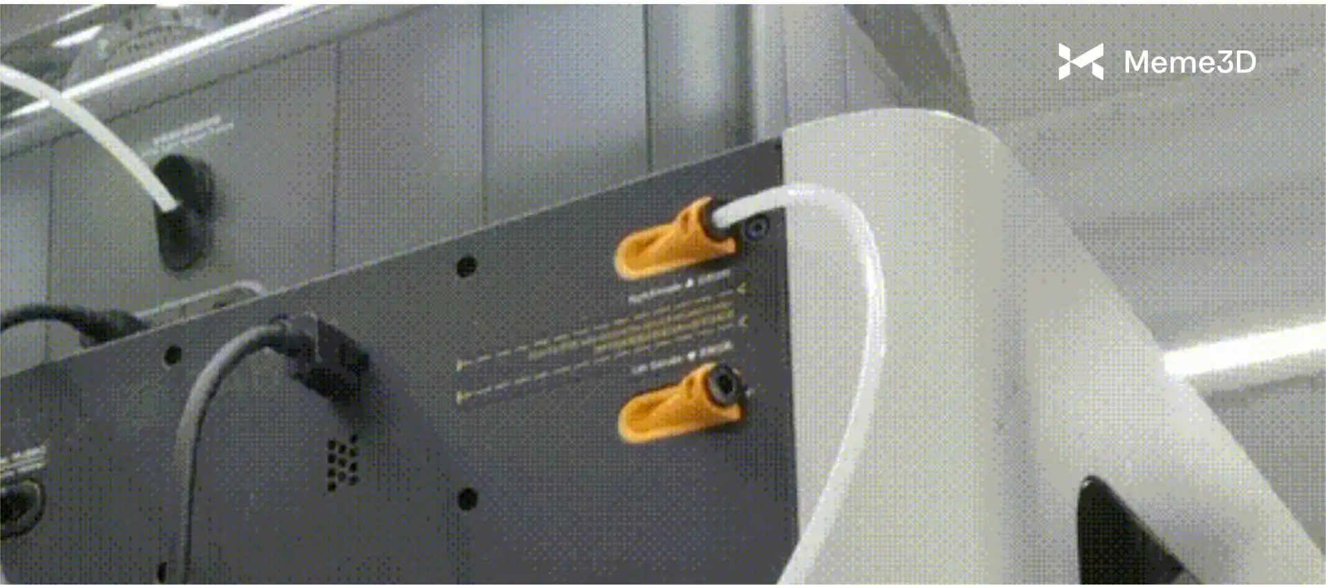 Trước tiên, hãy tháo các ống dẫn từ phía sau H2D. Thực hiện bằng cách nhấn vào vòng ngoài màu đen của đầu nối khí nén, sau đó mở khóa và kéo ống PTFE ra.
