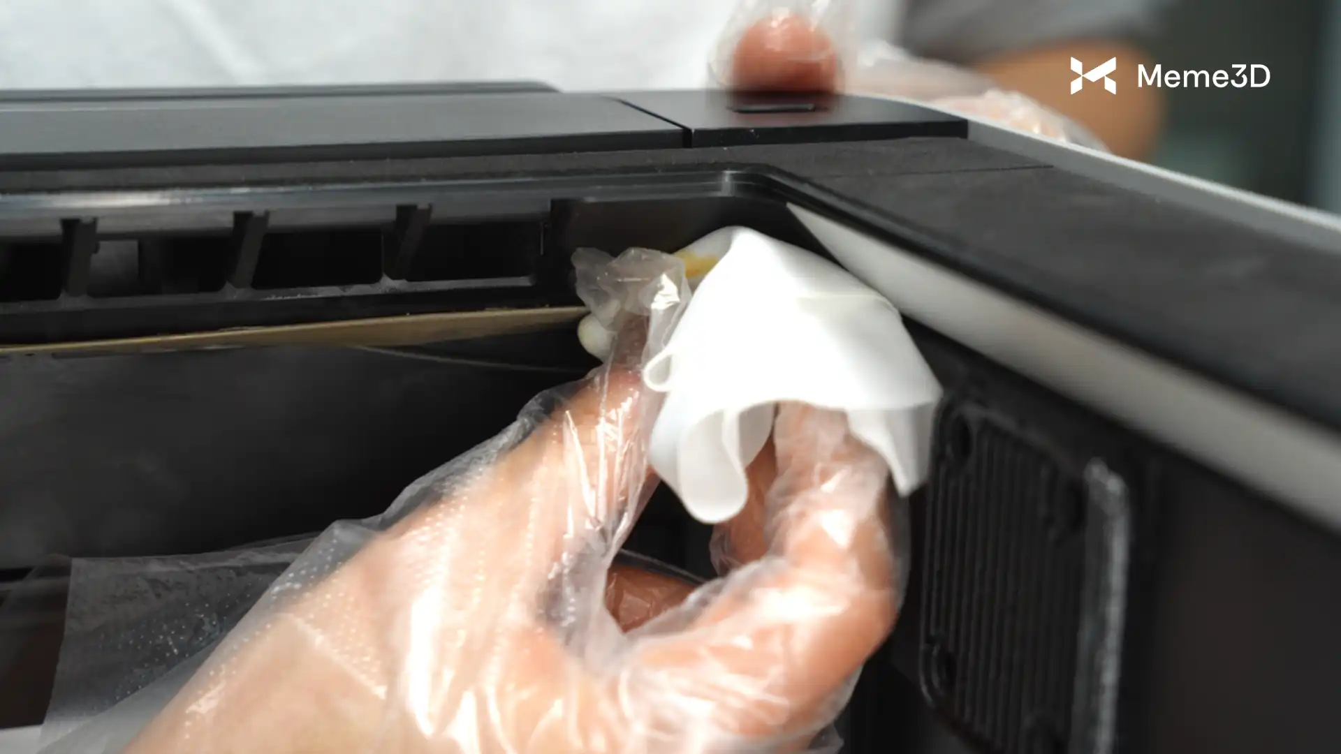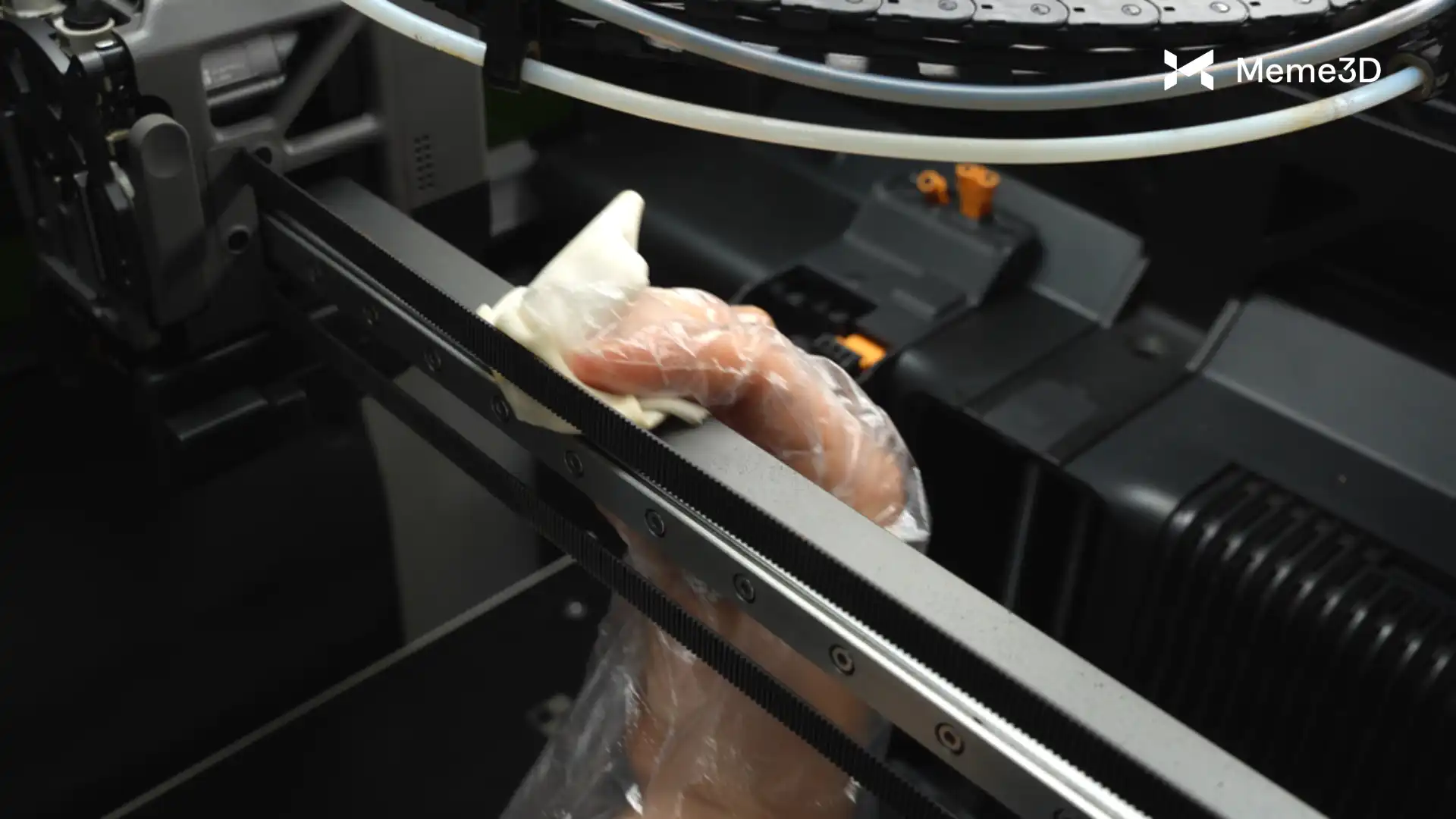 Chúng ta hãy bắt đầu với các thanh dẫn hướng tuyến tính. Giống như trục Y, các thanh dẫn hướng cần được làm sạch trước bằng vải không dệt. Để bắt đầu, hãy quấn một miếng vải không dệt quanh thanh dẫn hướng tuyến tính của trục Z và di chuyển lên xuống để lau, đảm bảo thanh dẫn hướng được làm sạch kỹ lưỡng.